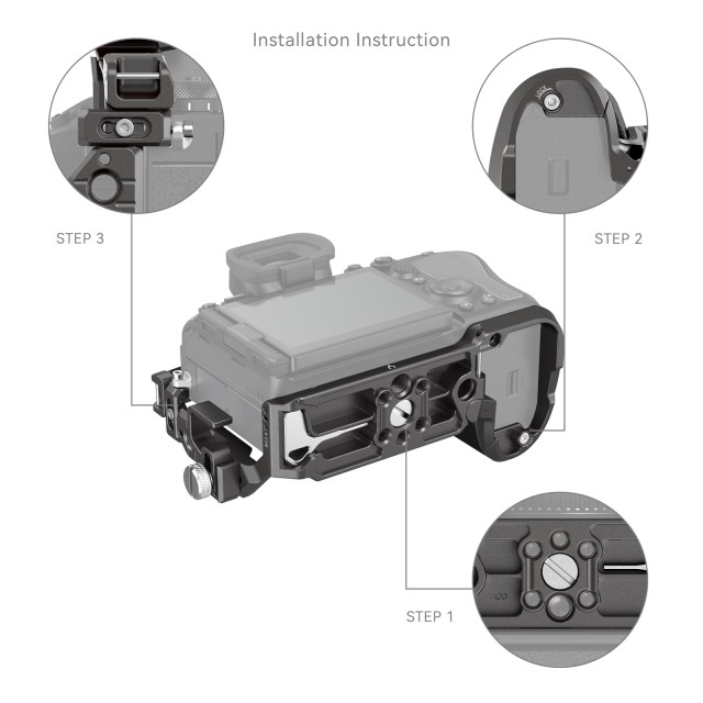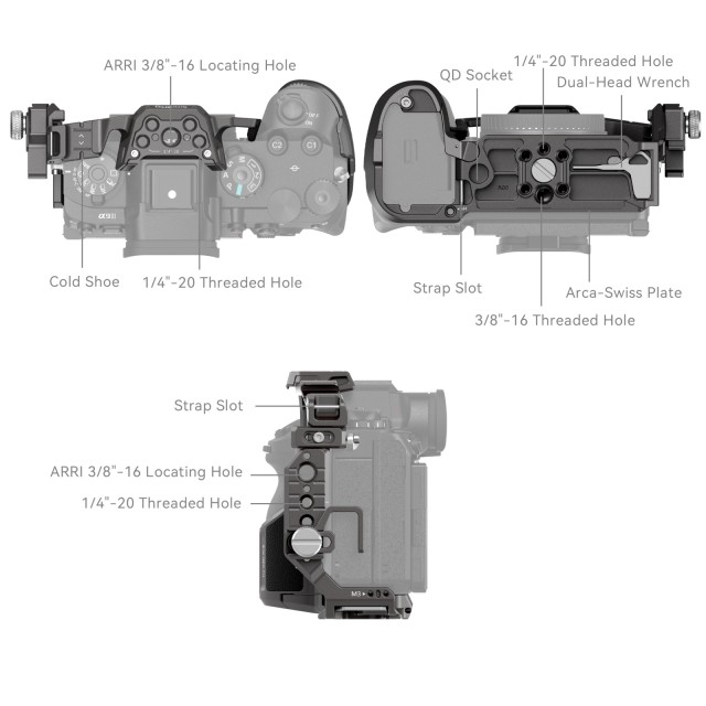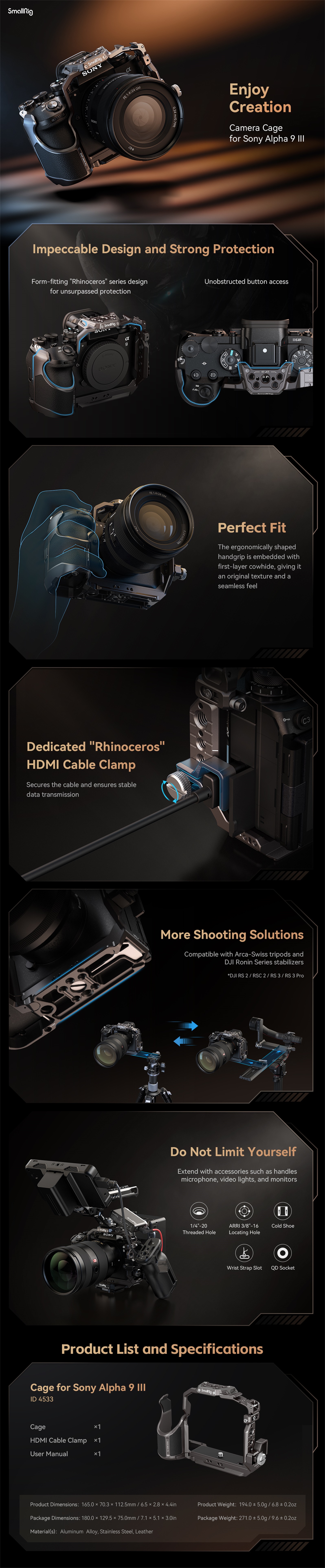 SmallRig Cage za Sony Alpha 9 III 4533 dizajniran je za pružanje zaštite kamere i proširenja s dodacima. Sustav zaključavanja u tri točke protiv progiba čvrsto učvršćuje Alpha 9 III putem klinova za lociranje, vijka 1/4"-20 na dnu i vijka M2,5 s lijeve strane. Aerodinamični dizajn kaveza osigurava nesmetan pristup gumbima, pružajući praktičnije iskustvo korištenja. Namjenska stezaljka HDMI kabela "Rhinoceros" učvršćuje kabele vijcima koji štite HDMI priključke i osiguravaju stabilan prijenos podataka. Višestruka ugrađena sučelja za montažu uključuju rupe od 1/4"-20 i ARRI 3/8"-16 lociranje rupe za pričvršćivanje gornje ručke (ID: 2165C ) ili bočne ručke (ID: 4016 ), ARRI 3/8"-16 rupa za lociranje za proširenje nosača monitora (ID: 2903B ), hladne cipele za mikrofon ili LED video svjetlo, QD utičnica za QD naramenicu. Ugrađena ploča za brzo otpuštanje Arca-Swiss na dnu kompatibilna je s DJI RS 2 / RSC 2 / RS 3 / RS 3 Pro, DJI RS 2 / RSC stabilizatorom s pločama za brzo otpuštanje i Arca-Swiss brzim otpuštanjem ploča (ID: 3154 ). Rupe za remen s lijeve strane i na dnu kaveza kompatibilne su s remenom za ruku (ID: 3848 ), remenom za nošenje na ramenu (ID: PSC2428) i ostalim dodacima. Osim toga, magnetski ključ na dnu kaveza dostupan je u bilo kojem trenutku za jednostavno rastavljanje i sastavljanje.