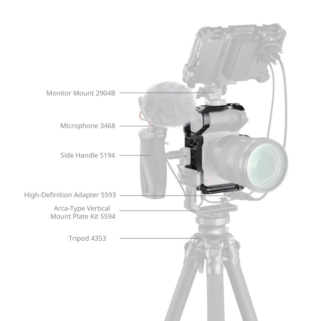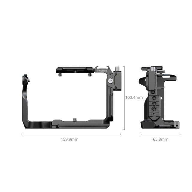 Odvojiva gornja ploča ima NATO šinu na koju se može postaviti Sonyjeva XLR gornja ručka ili SmallRigova rotirajuća gornja ručka (ID 4152 ) bez ometanja EVF-a. Kavez uključuje više točaka za montažu, uključujući navojne rupe od 1/4"-20, ARRI rupe za lociranje od 3/8"-16 i NATO šinu "HawkLock" za brzo pričvršćivanje dodataka poput bočnih ručki (ID 4485 ) i gornjih ručki (ID 4483 ). Nosač s hladnim stopalom omogućuje pričvršćivanje uređaja poput DJI Mic 2 ili LED svjetala, dok QD utičnica na podnožju prihvaća naramenice za poboljšanu prenosivost. Podnožje je također opremljeno magnetskim imbus ključem, što olakšava brzu montažu i demontažu.