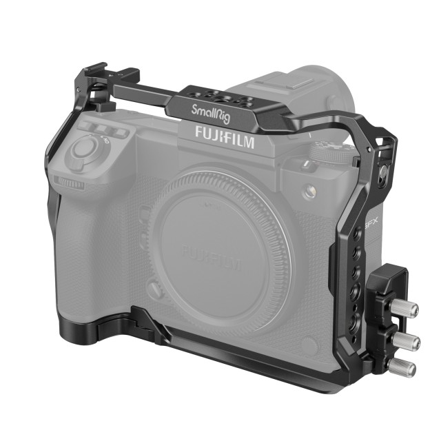 Sada SmallRig Cage Kit pro fotoaparát FUJIFILM GFX100 II 4201 je určena k ochraně fotoaparátu a upevnění příslušenství. Sada obsahuje klec a svorku pro kabely HDMI a USB-C. Klec, která zajišťuje fotoaparát FUJIFILM GFX100 II pomocí jednoho šroubu 1/4"-20 na spodní straně a jednoho bočního zajišťovacího adaptéru na obou stranách, je vybavena gumovými podložkami, které zabraňují poškrábání. Ponechává prostor pro EVF, chladicí ventilátor FAN-001 a poskytuje plný přístup k tlačítkům, slotům na karty, výklopnému displeji a bateriovým dvířkům. Mezi jeho montážní body patří závitový otvor 1/4"-20, polohovací otvor ARRI 3/8"-16, lišta NATO, studená patka a polohovací otvor 1/4"-20. Podporuje boční rukojeť 2093C / 4016 / 3847, horní rukojeť 3765, držák monitoru 2903 / 2904, mini V Mount Battery Plate 2987, svorka na jednu tyč 3598, Magic Arm 3873, mikrofon 3468, LED video světlo 4055 atd. Nechybí ani otvory pro popruhy pro ruční popruh 3848 a ramenní popruh 3485, QD úchyty pro ramenní popruh 4118 a spodní rychloupínací destička Arca Swiss pro stativy typu Arca nebo gimbaly DJI RS 2 / RSC 2 / RS 3 / RS 3 Pro pro rychlé přepínání mezi režimy gimbalu, ručního držení a stativu. A svorka kabelu HDMI a USB-C, zajištěná šroubem s palcem, pomáhá zajistit stabilní přenos signálu.