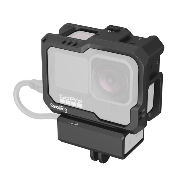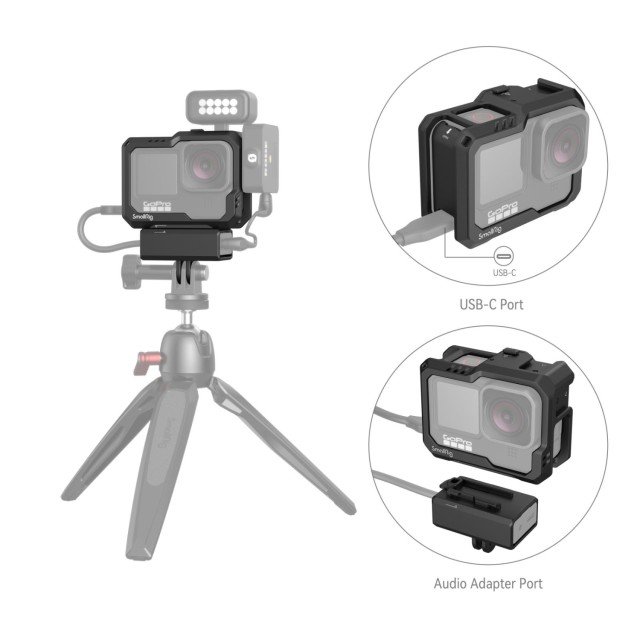 Ovaj kavez prilagođenog oblika izrađen je tako da se besprijekorno uklapa oko vaše GoPro kamere bez ometanja funkcionalnosti, uključujući podršku za zamjenu Max objektiva. Ima brzootpuštajući audio adapter na dnu za jednostavno postavljanje i skidanje audio pribora, dok brzootpuštajuća bočna ploča osigurava jednostavan pristup USB-C priključku za punjenje ili prijenos podataka bez uklanjanja kaveza.