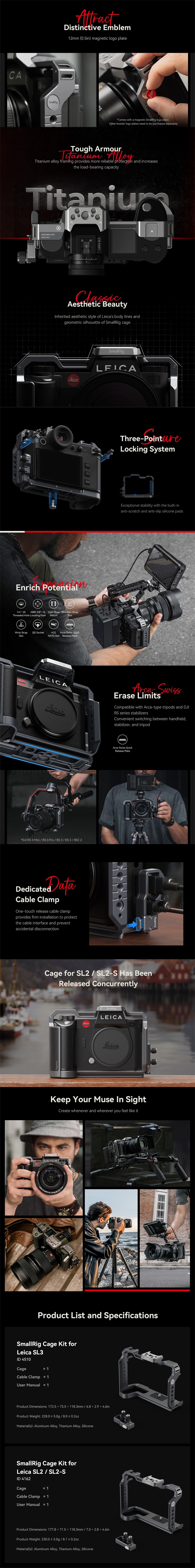 SmallRig Cage Kit za Leica SL3 4510 dizajniran je za zaštitu fotoaparata i proširenje fotoaparata dodacima koji olakšavaju vašu kreativnost. Sustav zaključavanja u tri točke fiksira kameru pomoću jednog 1/4"-20 vijka na dnu i dva bočna adaptera za zaključavanje. Ugrađeni silikonski jastučići štite kameru od ogrebotina. Svi nosivi dijelovi izrađeni su od titana od legure, što čini kavez robusnim i izdržljivim i omogućuje nesmetan pristup svim sučeljima kamere. Dostupno je višestruke mogućnosti montaže, uključujući otvor s navojem 1/4"-20, ARRI 3/. 8"-16 rupa za lociranje i rupa za lociranje 1/4"-20. Ove se opcije mogu koristiti za pričvršćivanje raznih dodataka kao što su gornja ručka ( 2165C ), bočna ručka ( 4015 / 4346 ), čarobna ruka ( 3875 ) za monitor ili odašiljač slike, mini V-Mount baterijska ploča (2987), Montažna stezaljka za prijenosne Power Bank ( 2336 ) za VB50 mini V-Mount bateriju i nosač za monitor ( 2903B / 2904B ). kao i nosač za hladnu obuću koji se može koristiti za mikrofon ( 3487 ) ili LED video svjetlo ( 4055 ). Nadalje, postoji utor za remen koji je kompatibilan s remenom za zapešće ( 3848 ) ili remenom za nošenje na ramenu ( PSC2428 ), QD utičnica koja podržava QD remen za nošenje na ramenu s brzim otpuštanjem ( 4118 ) i ploča za brzo otpuštanje Arca-Swiss koja omogućuje kompatibilnost sa stativima tipa Arca i DJI RS 2 / RSC 2 / RS 3 / RS 3 Pro gimbalima. Ugrađeni plosnati ključ olakšava montažu i demontažu pribora. Kabelska stezaljka za otpuštanje jednim dodirom omogućuje brzu i čvrstu instalaciju kako bi se zaštitilo sučelje kabela i spriječilo slučajno odspajanje.