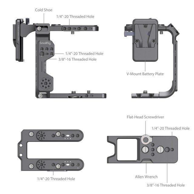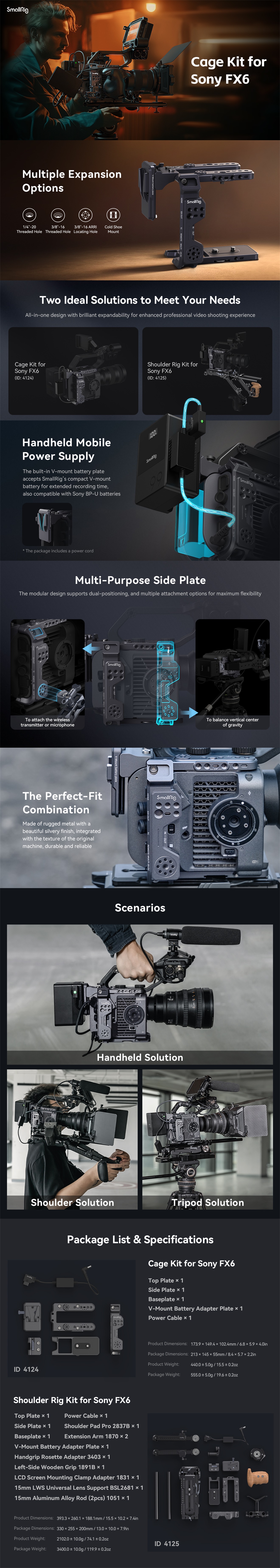 SmallRig Cage Kit za Sony FX6 4124 je lagan, kompaktan i dizajniran za držanje dodataka i pružanje zaštite. Sastoji se od gornje ploče, ploče za postavljanje V-baterije, bočne ploče, osnovne ploče i kabela za napajanje. Sve u svemu, komplet se dobro slaže sa Sony FX6 u pogledu dizajna i boje. Među tim dijelovima je V-mount stražnja ploča baterije zajedno s kabelom za napajanje koji povezuje bateriju kao dodatni izvor napajanja za produljeno vrijeme rada. Može se izbaciti i zaključati kako bi se olakšala zamjena memorijske kartice i ugradnja BP-U baterije. Uklonjiva bočna ploča kada se montira u blizini stražnje strane ostavlja prostora za originalni zahvat i podržava mikrofon, odašiljač slike itd., a kada se montira u blizini prednje strane pomaže u ravnoteži fotoaparata pri snimanju portreta. A matična ploča radi bolji posao nego samo ploča za brzo otpuštanje u zaštiti fotoaparata od pregrijavanja. Osim toga, uključeni su odvijač i imbus ključ za jednostavno sastavljanje i rastavljanje.
