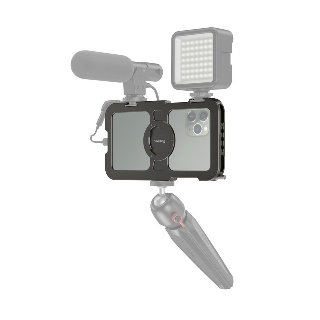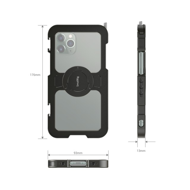 SmallRig Pro Mobile Cage za iPhone 11 Pro Max CPA2512 dizajniran je za zaštitu vašeg iPhone 11 Pro Max i omogućuje vam pričvršćivanje drugih dodataka za mobilno fotografiranje i video snimanje, live streaming, intervjue, vlogging itd. Ima vijak na jednoj strani koji osigurava brzu montažu i demontažu telefona. Opremljen je s dvije noge i nekoliko 1/4"-20 rupa s navojem za montažu raznih dodataka kao što su mikrofon, LED svjetlo, tronožac, itd., te podržava vodoravno i okomito snimanje. Kompatibilan je s SmallRig aluminijskim bočnim držačem za pametni telefon kavez HSS2424 za snimanje iz ruke i s kavezom za mobilni telefon BSC2390 SmallRig stezaljka za kabel za pričvršćivanje kabela tijekom snimanja. Ugrađeni gumeni jastučići pomažu apsorbirati udarce i sprječavaju ogrebotine telefona. Šuplji dizajn za smanjenje težine i hlađenje mobitela izbjegava bočnu stranu tipke i sučelja kao i antenu za područja kako bi se izbjegao rizik od interferencije signala. Također ima rupu za uže za zapešće.