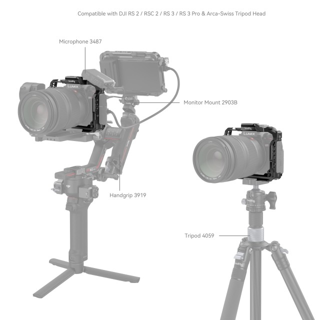 Također dolazi s dva hladna nosača za montiranje mikrofona i LED video svjetla; NATO gornja tračnica za gornju ručku 3322 ; lijeva NATO tračnica za bočnu ručku 3847 ; i donji QD utor za ugradnju QD naramenice. Na dnu se nalazi Arca-Swiss ploča za brzo otpuštanje, pogodna za DJI RS 2 / RSC 2 / RS 3 / RS 3 Pro gimbal i Arca-Swiss stative, kao i otvor s navojem za DJI RS 2 / RSC 2 gimbal ploča za brzo otpuštanje (podloška za povećanje visine) i ploča za brzo otpuštanje Arca-Swiss 3154 . Predmet je također opremljen rupama za remen na obje strane i na dnu, koji su kompatibilni s PAC2456 remenom za ruku, PSC2428 remenom za rame, itd. Osim toga, uključen je magnetski ključ za jednostavno rastavljanje i sastavljanje.