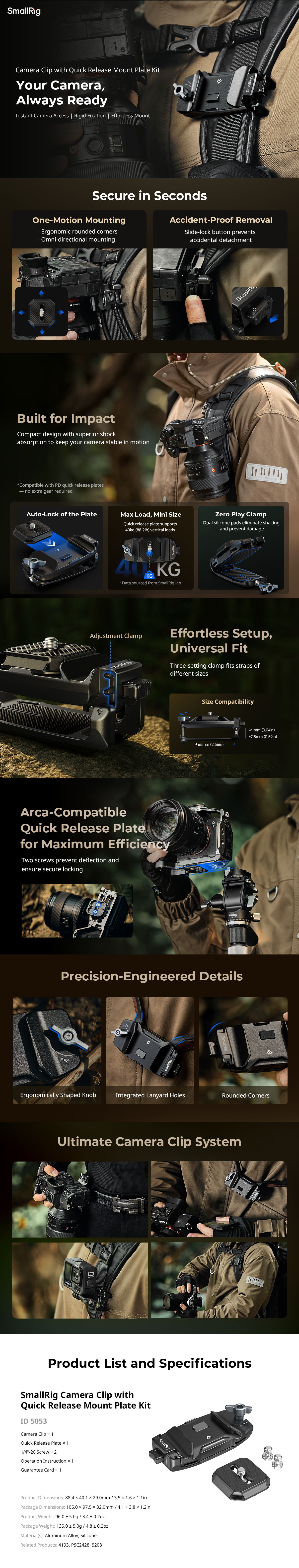 SmallRig Camera Clip with Quick Release Mount Plate Kit 5053 je posebno dizajniran za fotografe koji su uvijek u pokretu. Komplet uključuje kopču za kameru, pločicu za brzo otpuštanje i vijak od 1/4''-20 te nudi jednostavan dizajn: ploča za brzo otpuštanje može se umetnuti u bilo kojem smjeru, automatski se zaključavajući na mjestu. Također podržava jednostruko otpuštanje, osiguravajući visokoučinkovito sastavljanje i rastavljanje.