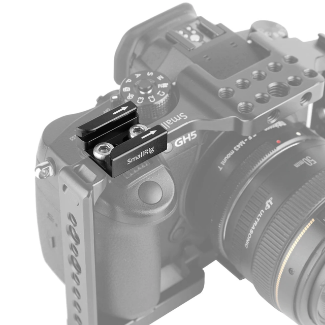 SmallRig Cold Shoe 1960 dolazi s dvije rupe od 1/4" za pričvršćivanje kaveza 2646 za Panasonic GH5 i GH5S, gornjom pločom za Blackmagic Ursa Mini / Mini Pro 1958, bočnom pločom za Blackmagic Ursa Mini / Ursa Mini Pro 1854, novom dvostrukom ručkom (sir ) 1625 i NATO stezaljka 1885 s dva vijka od 1/4". Dvije strelice pokazuju na ugrađenu grbu, a hladna cipela je mogla pričvrstiti Articulating Rosette Arm(7") 1497, mikrofon i prijemnik bežičnog mikrofona, itd. Ugrađeni odbojnik dobro učvršćuje pribor. Osim toga, u rupe od 1/4" između matice i određenog prostora održava vruća papučica, tako da su kontakti vruće papučice zaštićeni.
