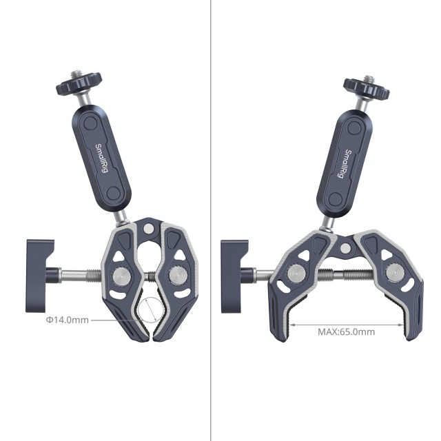 SmallRig Crab-Shaped Super Clamp Kit (s kuglastom magičnom rukom) 5529 izrađen je od aluminijske legure zrakoplovne kvalitete i nehrđajućeg čelika, s CNC obradom i preciznim rezbarenjem za poboljšanu čvrstoću i izdržljivost. Uključuje bioničku strukturu kostura i dizajn stezaljke u obliku morskog psa za jaču silu stezanja, dok ARRI 3/8"-16 rupe za lociranje i 3/8"-16 rupa s navojem omogućuju bogato proširenje pribora.