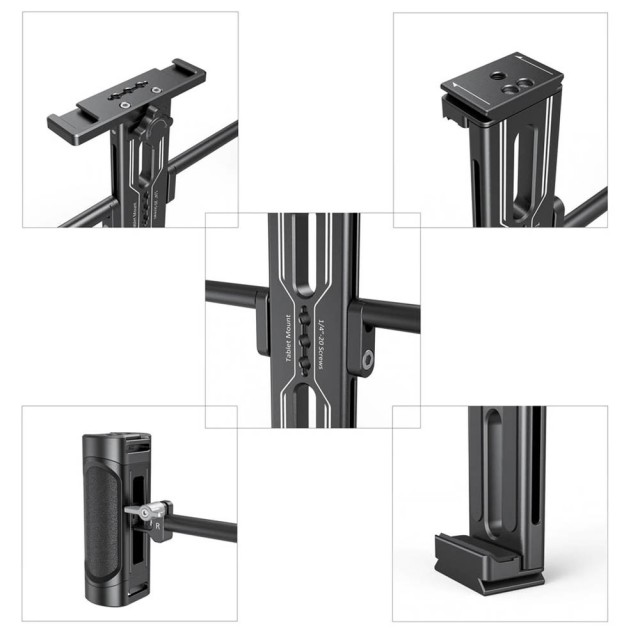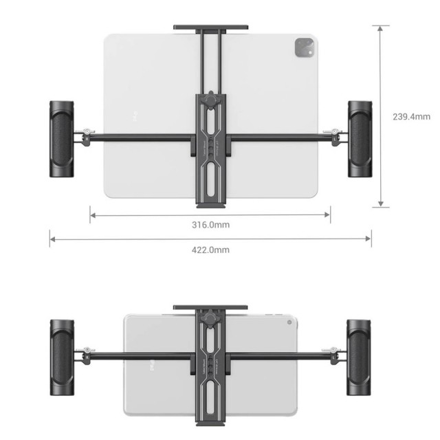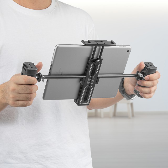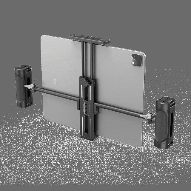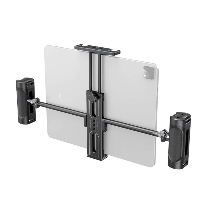 SmallRig 2929B Dual Grip iPad Tablet Mount dizajniran je za jednostavno montiranje iPada ili tableta i korištenje kao monitor za redatelja. Kompatibilan je s iPadom od 7,9" do 12,9" ili drugim tabletima slične veličine, sa ili bez zaštitne futrole. Ugrađeni gumeni jastučići sprječavaju grebanje iPada. Opremljen je s dvije uklonjive ručke koje se mogu slobodno podešavati za udobnije korištenje u ruci. Ušice za remen na ručkama omogućuju pričvršćivanje remena za ruku ili naramenice. Dolazi s bazom u stilu Arca-Swiss s rupom s navojem od 1/4 za brzo montiranje/demontiranje stativa. Također ima višestruke rupe s navojem od 1/4"-20 i dva hladna nosača za pričvršćivanje drugog pribora.