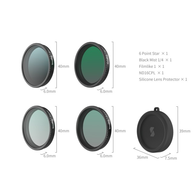Ovaj komplet uključuje 1/4 filter za crnu maglu, ND16 i CPL filter, filter za simulaciju filma, zvjezdani križni filter i silikonski poklopac za objektiv. 1/4 filter za crnu maglu omekšava istaknute dijelove za sanjiv, filmski efekt. ND16 i CPL filter uklanja refleksije, a istovremeno osigurava vjernu reprodukciju boja, što ga čini idealnim za pejzažnu i arhitektonsku fotografiju u uvjetima jakog svjetla. Filter za simulaciju filma stvara analogne filmske tonove, savršene za portrete, uličnu fotografiju i snimke u vintage stilu. Zvjezdani križni filter transformira točkaste izvore svjetlosti u dramatične zvjezdane bljeskove sa 6 točaka tijekom noćnih scena. Za dodatnu praktičnost i zaštitu, komplet uključuje mekani silikonski poklopac za objektiv koji štiti objektiv vašeg fotoaparata od ogrebotina i prašine kada se ne koristi.