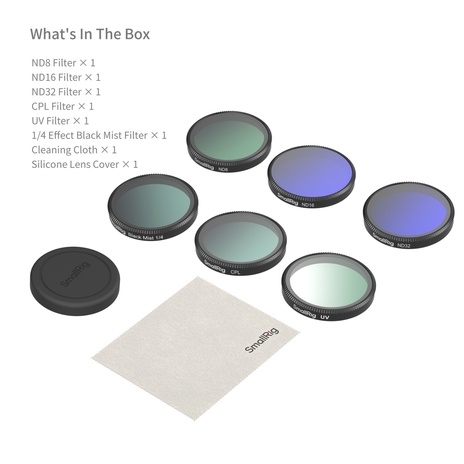 Paket uključuje ND8, ND16 i ND32 filtere, CPL filtar, UV filtar, 1/4 efektni filtar "black mist", silikonsku zaštitu za objektiv i krpu za čišćenje. Set ND filtara pruža idealno smanjenje svjetla u različitim okruženjima, istovremeno obogaćujući vaš snimak živopisnim bojama. CPL filtar učinkovito uklanja neželjene odraze s nemetalnih površina poput vode i stakla, istovremeno poboljšavajući vidljivost pod vodom i kroz prozore. UV-filter štiti objektiv od ogrebotina i udaraca, dok 1/4 black mist filter omekšava naglašene svjetline za sanjani, filmski efekt. Dizajn s brzim klikom omogućuje izravno postavljanje bez potrebe za skidanjem objektiva, čime se značajno poboljšava učinkovitost snimanja.