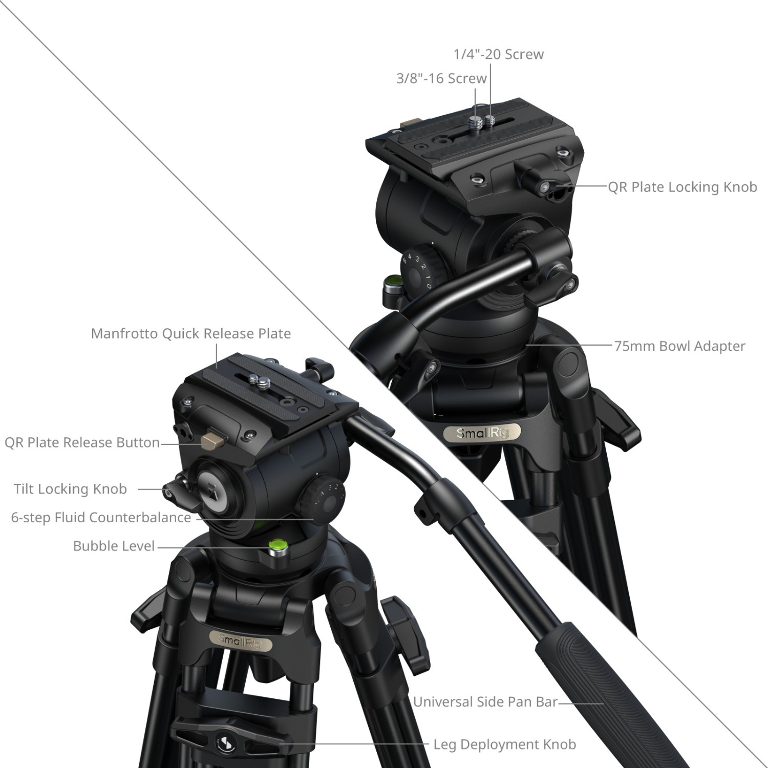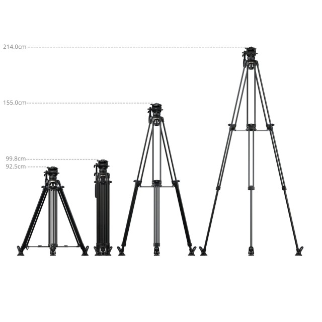 Izrađen s nogama od legure aluminija (Ø16 mm) u konfiguraciji od 3 sekcije (2-2-1) i standardnom bazom zdjele od 75 mm, stativ se kombinira s fluidnom glavom koja ima 6-stepeno protutežno podešavanje. Mehanizam protuteže podnosi opterećenja od 0 kg do 6 kg, dok glava omogućuje sigurno radno opterećenje od 10 kg i maksimalni kapacitet opterećenja od 15 kg. Radna visina stativa kreće se od 92,5 cm do 214 cm (36,4 in do 84,3 in), osiguravajući stabilnost pri velikim opterećenjima i glatko kretanje za snimanje iz visokih kutova.