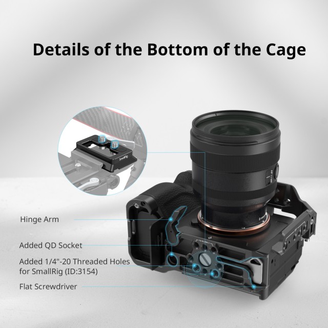 Arca ploča s brzim otpuštanjem na dnu kompatibilna je s DJI RS 2/RSC 2 i DJI RS 2/RSC 2 pločom (podlogom) s brzim otpuštanjem za snimanje sa stabilizatorom. Dodatna HDMI 3000 stezaljka za kabel radi s kamerom Alpha 7 IV/Alpha 7S III kako bi zaštitila sučelje i osigurala stabilan prijenos signala tijekom snimanja. Rupe na stranama i dnu kaveza omogućuju pričvršćivanje dodataka kao što su PAC2456 remen za ruku i PSC2428 remen za rame. Osim toga, kavez je opremljen ugrađenim magnetskim ključem koji olakšava rastavljanje i sastavljanje