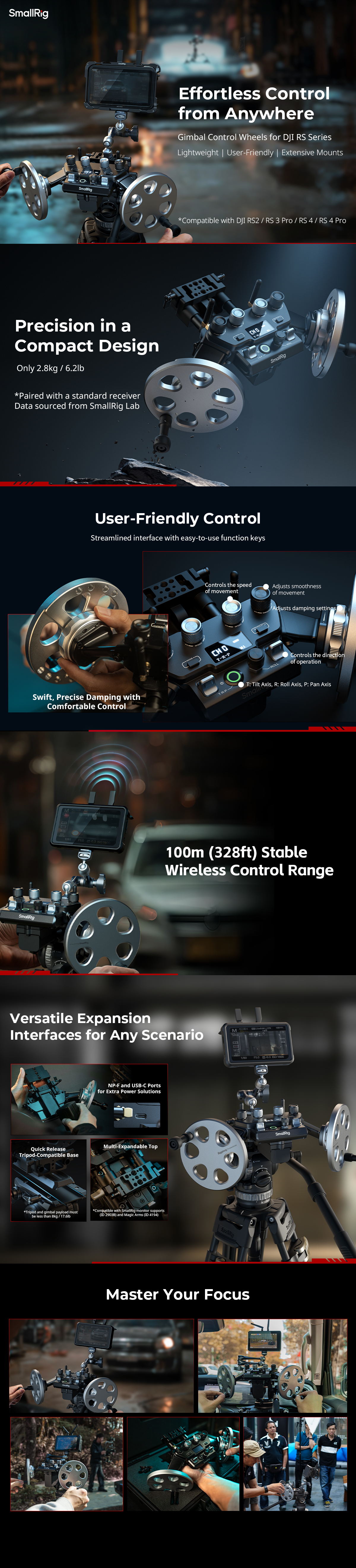 SmallRig Gimbal Control Wheels za DJI RS Series 4525 dizajniran je za poboljšanje precizne kontrole DJI RS2, RS3 Pro, RS4 i RS4 Pro stabilizatora. Teži samo 2,76 kg, prenosiv je i savršen za snimanje u pokretu. Kontrolni kotačić opremljen je pločom jednostavnom za korištenje s gumbima za podešavanje brzine, glatkoće i prigušenja, kao i polugama za kontrolu smjera i podešavanje TRP osi.