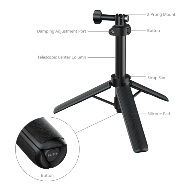 Optimiziran za prenosivost, njegov teleskopski stupanj od 4 dijela sklopiv je na 18 cm (7,1") za jednostavno pohranjivanje u ruksak ili džep, a ipak se može produžiti do 52 cm (20,5") kako bi zadovoljio širok raspon zahtjeva za visinom snimanja.