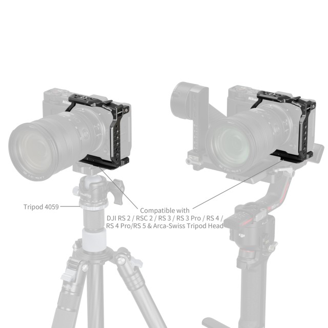 SmallRig polu-okvir za Nikon ZR 5905 dizajniran je za povećanje proširivosti i pojednostavljenje montaže gimbala. Njegova lagana konstrukcija s polu-poklopcem omogućuje jednostavnu instalaciju bez odvajanja pločice za brzo otpuštanje DJI RS gimbala, čime se pojednostavljuje rad i štedi vrijeme. Osnova ima ugrađenu Arca-Swiss ploču za brzo otpuštanje, što omogućuje izravno montiranje na stative Arca tipa (ID 5290, 4222B) i DJI gimbale (RS 2, RSC 2, RS 3 Pro, RS 4 Pro) za brze prijelaze između postavki.