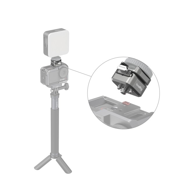 SmallRig HawkLock H18 Quick Release Support with Cold Shoe 4500 sastoji se od brzootpuštajućeg adaptera hladnog papuče i brzootpuštajuće osnovne ploče hladnog papuče. Jednim klikom, stup protiv odvajanja na dnu adaptera za brzo otpuštanje, u kombinaciji s dizajnom utora na vrhu osnovne ploče, zaključava hladnu cipelu na mjestu, učinkovito sprječavajući njeno klizanje i osiguravajući glatko i sigurno sastavljanje. Može držati do 800g. Gornji dio brzootpuštajućeg adaptera za hladnu cipelu opremljen je silikonskim jastučićima kako bi se izbjegle ogrebotine na dodacima za hladnu cipelu, a istovremeno osigurava stabilniju vezu i smanjuje podrhtavanje. Adapter može pretvoriti uobičajene dodatke za hladne cipele (kao što su LED video svjetlo, mikrofon itd.) u one koji imaju dizajn za brzo otpuštanje, što ga čini učinkovitijim i štedi vrijeme. Osnovna ploča opremljena je klinovima za lociranje s oprugom za podršku kavezima SmallRig akcijskih kamera kao što su 4119B , 3084C , 4088B i razni drugi s rupama za lociranje kako bi se osigurala sigurnost i stabilnost.