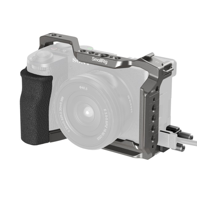 Kavez ima sustav zaključavanja u tri točke koji uključuje klin na dnu i M2,5 vijke s obje strane, osiguravajući sigurno i čvrsto prianjanje. Također sadrži silikonsku podstavu koja štiti kameru od ogrebotina. Nadalje, vratašca na šarkama u pretincu za baterije poboljšavaju držanje pružajući dodatnu potporu za mali prst. Stezaljka HDMI kabela ima vijak za pričvršćivanje bez alata na lijevu stranu kaveza, osiguravajući sigurnu vezu za stabilan prijenos podataka.