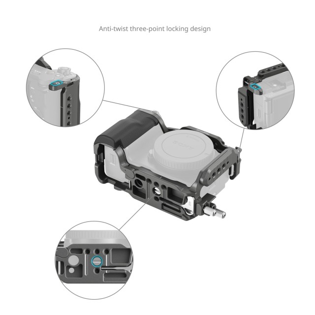 Sustav zaključavanja u tri točke sigurno pričvršćuje kavez za fotoaparat s donjom iglom za lociranje, vijkom 1/4"-20 i vijkom M2.5 na lijevoj strani kako bi se spriječilo bilo kakvo odstupanje, dok podstava sa svih strana sprječava ogrebotine na pretinac za baterije ima vratašca sa šarkama koja se bolje prilagođavaju oblinama kućišta fotoaparata, čime se rješava problem gdje postaviti mali prst i poboljšava se držanje.