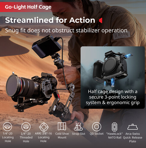 SmallRig 5953 Half Cage je elegantan, lagani kavez dizajniran posebno za fotoaparate Canon EOS R6 Mark III, R6 Mark II i R5 Mark II. Izrađen od izdržljivog aluminija, ovaj polu-kavez nudi izvrsnu zaštitu bez nepotrebnog dodavanja veličine. Ima Hawklock NATO šine za jednostavnu i sigurnu montažu dodatne opreme, poput ručki ili monitora, dok osnovna ploča tipa Arca omogućuje brzo pričvršćivanje na stative, osiguravajući glatke prijelaze između ručnih i stativnih postavki.