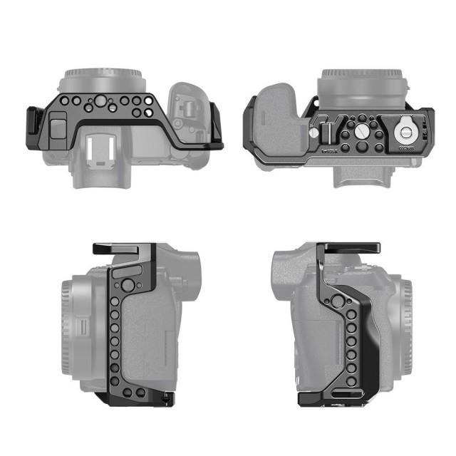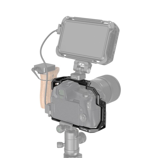 je puni kavez koji pristaje obliku i dizajniran za zaštitu i nosače dodatne opreme za vaš fotoaparat. Kavez se pričvršćuje na dno kamere vijkom od 1/4"-20 i ima dva klina protiv prevrtanja. Ima više rupa s navojem od 1/4"-20 i 3/8"-16, ARRI navoje za dodatke i hladnu cipelu koja vam omogućuje montiranje dodataka. Na primjer, možete pričvrstiti SmallRig 2165 Top Handle ili SmallRig 2093 Wood Side Handle za snimanje iz ruke; pričvrstite SmallRig Ball Head Magic Arm 2070 ili SmallRig 1842 Monitor Mount za pričvršćivanje monitor. Radi s kabelskom stezaljkom SmallRig 1822 za zaštitu HDMI kabela i priključka. Ako koristite Canon EF-EOS R adapter za objektiv, možete koristiti SmallRig BSA2696 za podupiranje nosača i smanjenje pritiska s teškog objektiva. kavez također ima ugrađenu Arca Swiss QR ploču i ravni odvijač na dnu.