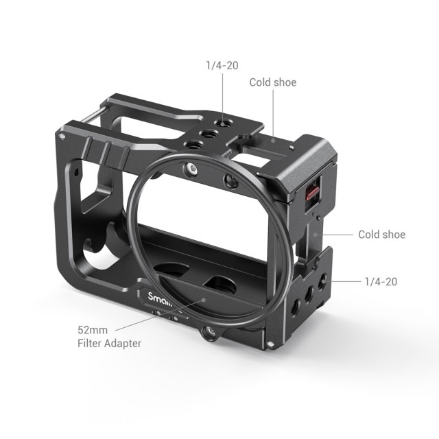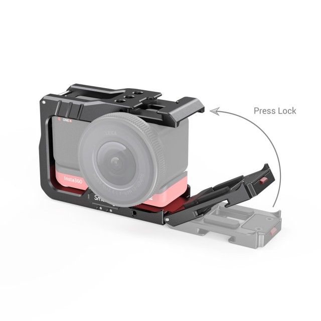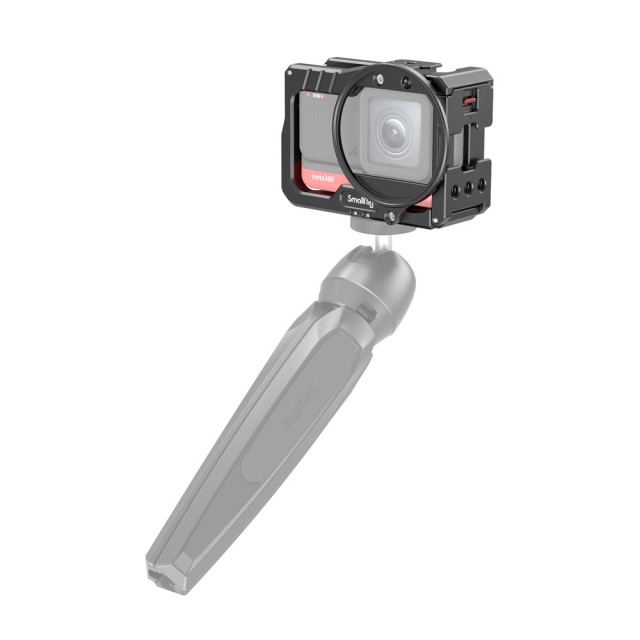 SmallRig Vlogging Cage i adapter za filtar od 52 mm za Insta360 ONE R 4K Edition 2901 aluminijski je kavez koji štiti kameru dok pruža dovoljno prianjanja za dodatke bez ometanja gumba ili priključka kamere. Jednostavno gurnite kameru u kavez sa strane i pritisnite poklopac da se zaključa na mjestu. Kavez je opremljen s dvije hladne cipele i nekoliko 1/4"-20 rupa s navojem za montažu dodataka kao što su mikrofon ili malo LED svjetlo. Preklopni prsti na dnu omogućuju pričvršćivanje kamere na različite GoPro nosače i površine, dok 1/4 "-20" u sredini dna omogućuje pričvršćivanje fotoaparata na tronožac 1/4"-20. Kavez je opremljen filterskim prstenom s navojem od 52 mm koji se može pričvrstiti i na prednju i stražnji dio kaveza.