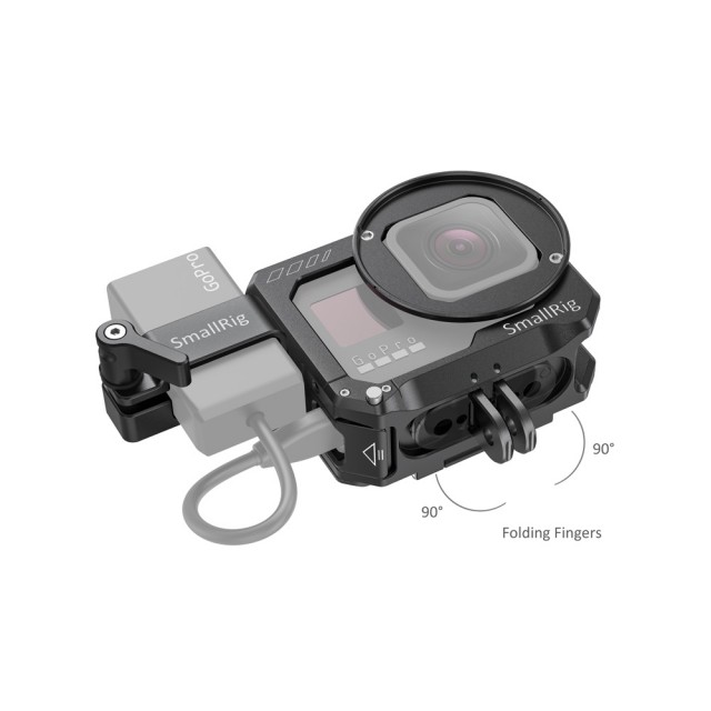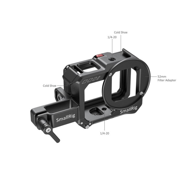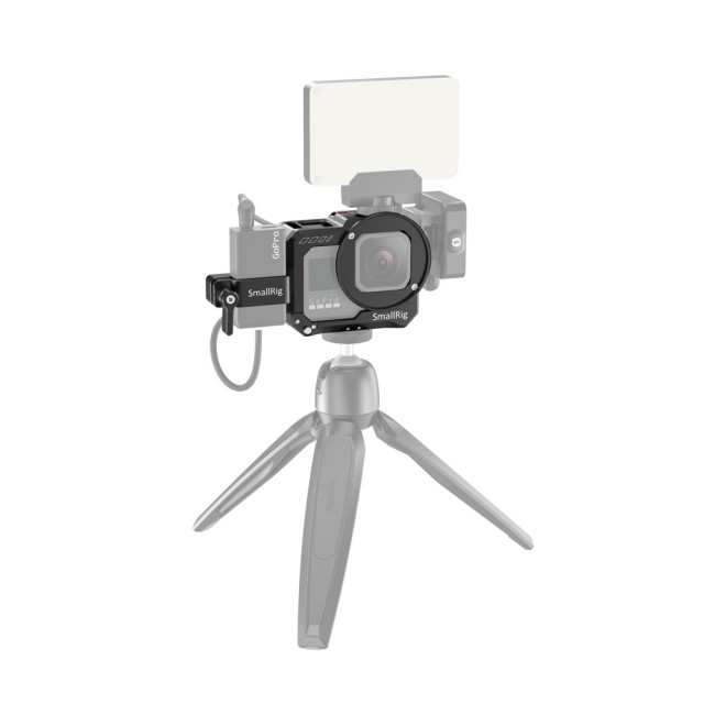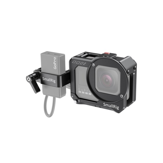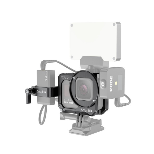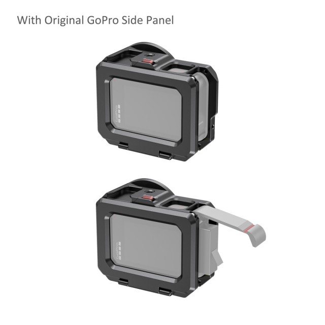 Kavez ima dvije hladne noge i nekoliko 1/4"-20 rupa za montažu dodataka kao što su mikrofon, malo LED svjetlo, SmallRig Cold Shoe Mount 1593 ili cold shoe 1960. Nosač GoPro mikrofona pričvršćuje se na desnu stranu kaveza s dva priložena vijka 1/4"-20. Sklopivi prsti na dnu omogućuju pričvršćivanje kamere na razne GoPro nosače i površine; dok nosač 1/4"-20 u sredini omogućuje pričvršćivanje fotoaparata na tronožac 1/4"-20. Bočna ploča je brza za zamjenu baterija, a kameru možete puniti putem USB-C priključka bez otvaranja ploče. Na prednjoj strani kaveza nalazi se filterski prsten koji prihvaća filtere s navojem od 52 mm.