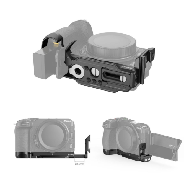 Nosač SmallRig L za Nikon Z 30 3860 dizajniran je za olakšavanje vodoravnog i okomitog snimanja i poboljšanje iskustva držanja. L-nosač, koji se pričvršćuje na dno fotoaparata vijkom od 1/4"-20, ima jastučiće koji sprječavaju grebanje i uvijanje. Vrata za bateriju imaju viseći krak koji se prilagođava zakrivljenosti fotoaparata za udobno držanje i jednostavna zamjena baterije. Osnovna ploča i bočna ploča opremljene su Arca-Swiss pločom za brzo otpuštanje za Arca-Swiss stativ za vodoravno i okomito snimanje. Rotira se za 160°; donje rupe s navojem 1/4"-20 za DJI RS 2 / RSC 2 / RS 2 / RS 3 / RS 3 Pro stabilizator ploča za brzo otpuštanje (gore) ili tronožac, rupe za 3848 remen za ruku i ugrađeni ravni odvijač za brzo otpuštanje dodataka.