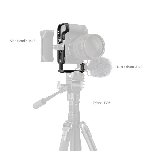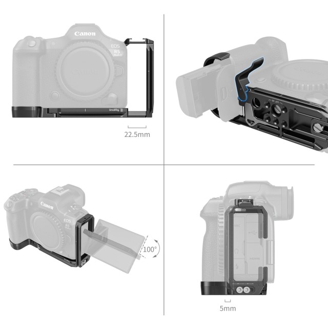 SmallRig ploča za montiranje u obliku slova L za Canon EOS R5 Mark II 4983 dizajnirana je za pomoć u brzom prebacivanju između pejzažne i portretne orijentacije, dok istovremeno poboljšava držanje tijela fotoaparata. Montažna ploča u obliku slova L čvrsto se pričvršćuje na kameru s 1/4"-20 vijkom na bazi i dva bloka za lociranje sa strane kako bi se spriječilo odstupanje i ima ugrađene silikonske jastučiće za zaštitu kamere od ogrebotina.