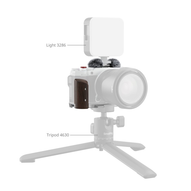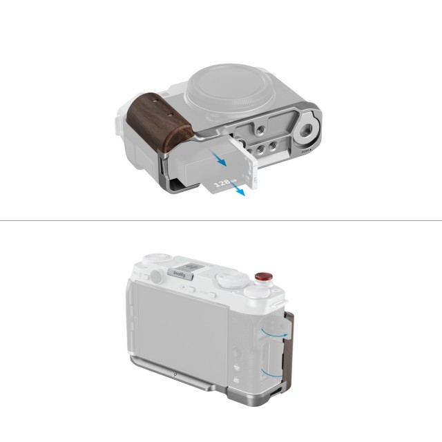 L-oblikovani rukohvat pričvršćuje se na fotoaparat vijkom od 1/4"-20 na dnu, a ugrađeni silikonski jastučići sprječavaju ogrebotine. Rukohvat je izrađen od prirodnog masivnog drva, elegantan s bogatim, prirodnim osjećajem i ergonomski dizajniran kako bi se poboljšao osjećaj držanja. Ugrađena baza za brzo otpuštanje Arca-Swiss omogućuje jednostavnu i brzu montažu i demontažu stativa tipa Arca. Četiri navojna otvora od 1/4"-20 na dnu za pričvršćivanje ploča i stativa tipa Manfrotto. Utor za remen za zglob (ID: 3848). Ugrađeni ravni ključ na dnu za jednostavnu montažu i demontažu pribora. Dolazi s vjetrobranom s ugrađenim nosačem za hladni papuč, koji smanjuje buku vjetra za 15 dB. Ugrađeni silikon na dnu sprječava grebanje papučice za vrući papuč. Rukohvat dolazi s ekskluzivnim poklopcem za vrući papuč s otisnutim zvučnim valom "FUJIFILM" i godinom osnutka kao naš posvet FUJIFILM-u. Također dolazi s gumbom okidača kako bi se osigurao mekan i udoban dodir prstima.