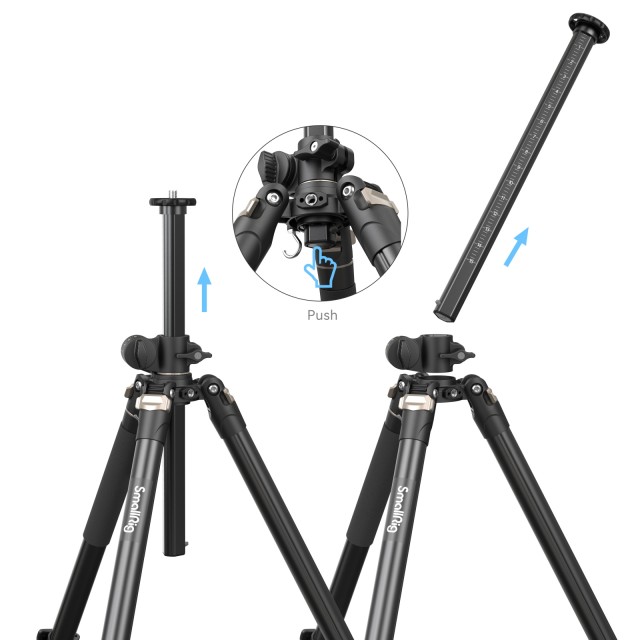 Stativ SmallRig Lateral Center Column CT200 4288 je jemně navržen pro natáčení, živé vysílání, vlogování atd. Sloupek je umístěn v horním odlitku stativu pro úsporu místa a lze jej přepnout do vertikální orientace. Čtyřsekční nohy s pákovými zámky umožňují během několika sekund nastavit pracovní výšku až na 185 cm a odnímatelný středový sloupek lze otočit pro záběry z nízkého úhlu. Demontáží jedné z nohou a jejím připojením k hlavě můžete stativ přeměnit na monopod. Horní šroub 3/8"-16 podporuje různé fluidní hlavy pro fotografování a natáčení videa; a otvor se závitem 1/4"-20 v kloubech nohou umožňuje připojit rameno Magic Arm 3874 & 3959 pro mikrofon, monitor, systém přenosu obrazu atd. Je vybaveno vestavěným vakem na závaží pro zvýšení stability. Silikonové podložky pod nohy mají skryté nožičky s hroty, které vyhovují různě složitým terénům a lze je používat i po sejmutí silikonových podložek pod nohy.