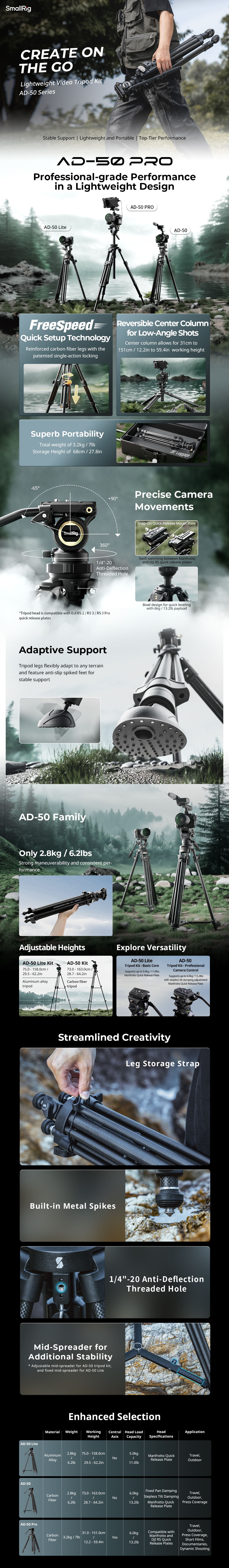SmallRig Lightweight video stativ od karbonskih vlakana AD-50 Pro 4420 dizajniran je za profesionalno video snimanje na otvorenom. Uz tehnologiju FreeSpeed, usvojite sustav zaključavanja u jednom koraku - upravljanje jednim prekidačem može brzo zaključati dva dijela nogu. Izrađene od karbonskih vlakana, i noge i središnji stup osiguravaju lagani dizajn uz iznimnu stabilnost i visoku nosivost. Radna visina kreće se od 31 cm (12,2 inča) do 151 cm (59,4 inča), a kompaktna duljina za pohranu iznosi 68 cm (26,8 inča). Središnji stup ima integriranu podlogu za zdjelu koja omogućuje podešavanje za brzo niveliranje, s odvojivim inbus ključem ugrađenim u video glavu za praktično sastavljanje/rastavljanje opreme za kameru i opciju za snimanje pod niskim kutom na minimalnoj visini od 31 cm (12,2 inča). ). Kompaktan dizajn stativa omogućuje da stane u bilo koju standardnu prtljagu.