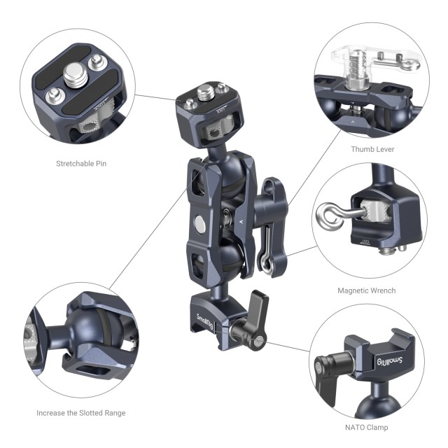 Dvostruka loptasta glava SmallRig Magic Arm (1/4"-20 vijak i NATO stezaljka) 3875 je kompaktna i lagana. Obje kuglaste glave su promjera 20 mm, a jedna je opremljena vijkom 1/4"-20 i produžnim klinovima koji sprječavaju uvijanje, a drugi ima NATO sponu koja podupire kavez, gornju ploču itd. s NATO šipkom. Podesiva poluga za palac pomaže držati glavu lopte pod pravim kutom i dolazi s malim magnetskim ključem na dnu za zatezanje kotačića za palac. Na oba kraja stezaljke kuglaste glave nalaze se urezi koji ostavljaju više prostora za fleksibilno podešavanje kuglastih glava i pribora montiranog na njih. Ovaj predmet teži samo 91 g, što ga čini lakim za nošenje i spremanje.