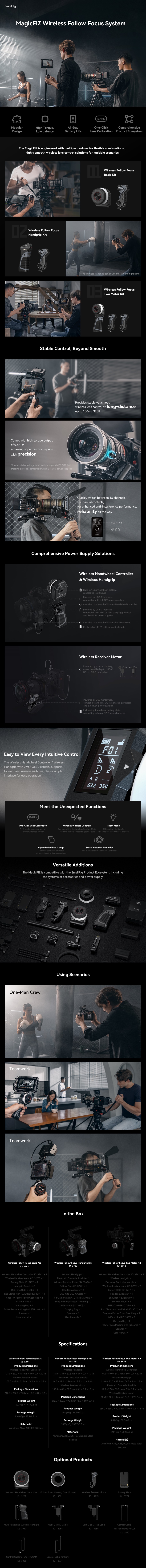 SmallRig MagicFIZ Wireless Follow Focus Two Motor Kit 3918 dizajniran je kako bi jednom fotografu ili fotografskom timu pružio precizno rješenje za praćenje fokusa za snimanje iz ruke, preko ramena i monitora. Bežični kontroler ručnog fokusa opremljen je baterijom od 1400 mAh i traje do 40 sati pri radu s bežičnom ručkom. Zajedno s elektroničkim kontrolnim modulom, opremljen je funkcijom memorije u slučaju nestanka struje, što vas štedi opetovane kalibracije leće i podešavanja AB točke, čime se povećava učinkovitost snimanja. Izuzetno učinkovit OLED zaslon od 0,96" s RGB svjetlosnim efektom i vibracijskom obavijesti pruža jednostavno, ali učinkovito iskustvo interakcije.
