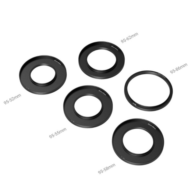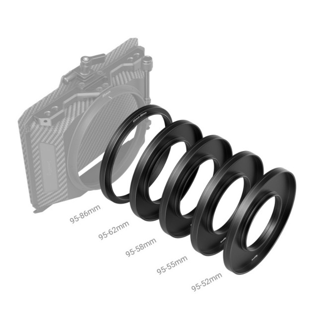 SmallRig komplet adapterskih prstenova (Φ52/Φ55/Φ58/Φ62/Φ86-Φ95) 3383 dodatni je dodatak koji radi s Mini Matte Boxom 3196. Njegovi adapterski prstenovi mogu se brzo pričvrstiti na standardne leće Φ52/Φ55/Φ58/Φ62/Φ86 i služi kao čvrsti oslonac za mat kutiju. Adapterski prstenovi prilagođavaju dizajn protiv pada, sprječavaju slučajno odspajanje i osiguravaju sigurno i pouzdano snimanje pri radu s Mini Matte Boxom 3196 . Kompatibilni su sa širokim rasponom okruglih filtara uključujući CPL i ND filtre do Φ92,5 mm i ostavljaju dovoljno prostora za brzo uklanjanje i podešavanje CPL filtarskih prstenova. Komplet je u potpunosti kompatibilan s različitim objektivima i korisnicima pruža izvrsno iskustvo snimanja u smislu brze instalacije i mijenjanja scene.