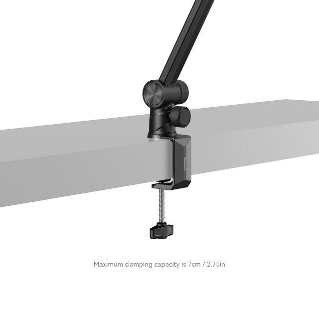 Stolní držák SmallRig Microphone Boom Arm 4303 se skládá z držáku mikrofonního ramene, držáku cold shoe, teleskopické tyče o průměru ⌀75 mm / 2,9 palce, deseti kabelových stahovacích pásků a dvou adaptérů se závitem, které se používají především pro nahrávání podcastů, živé streamování zvuku, vlogování a další podobné scénáře. Hlavní tělo je vyrobeno z materiálu z hliníkové slitiny, což zajišťuje robustní stabilitu s nosností 1,5 kg, která splňuje běžné potřeby montáže mikrofonů na trhu. Ve spojení s teleskopickou tyčí ⌀75 mm / 2,9 palce umožňuje bezproblémové připojení většiny mikrofonů Canon a eliminuje rušení od mikrofonních kabelů a stojanů. Díky třem velikostem závitových adaptérů (1/4"-20, 3/8"-16, 5/8"-27) se přizpůsobí různým mikrofonním rozhraním. Při použití s držákem se studenou botkou podporuje montáž bezdrátových mikrofonů Lavalier, jako jsou DJI Mic, DJI Mic 2, RODE WIRELESS GO a další. Na rozdíl od běžných mikrofonních ramen je tento stolní držák vybaven třemi hydraulickými tlumicími klouby, které umožňují nastavení více úhlů. Nastavení vyžaduje externí sílu, aby se zabránilo náhlým odrazům vyvolaným pružinami, rovněž konstrukce hydraulického tlumení zaručuje tiché a plynulé nastavení, což zajišťuje kvalitní snímání zvuku zajišťující tišší a bezpečnější nastavení i kvalitní nahrávání. Základna je vybavena nastavitelným zajišťovacím knoflíkem, který zajišťuje, že stolní držák podporuje otáčení o 360° a zároveň zabraňuje náhodnému odpojení a možnému poškození zařízení. Spodní svorka dokáže bezpečně uchytit desky stolů o tloušťce až 7 cm, což vyhovuje většině velikostí stolů. Součástí sady je 10 stahovacích pásků pro uspořádání kabelů zařízení, které zajišťují čistý a uklizený pracovní stůl.