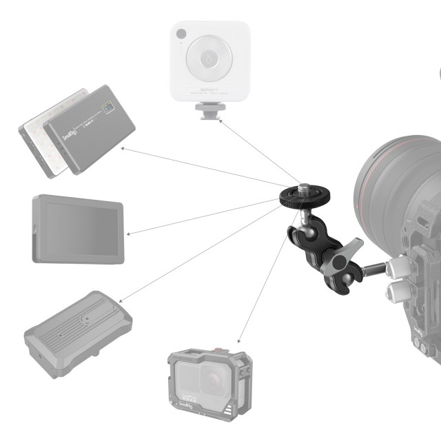 SmallRig Mini Magic Arm s univerzalnom kuglastom glavom 3238 sastoji se od dvije kuglaste glave s 1/4"-20 vijkom i stezaljkom s kuglastom glavom. Jedan kraj može se pričvrstiti na vrh ili stranu kaveza, a drugi na monitor. Ugrađen jastučići sprječavaju grebanje Fleksibilan je i može se lako namjestiti pod odgovarajućim kutom Kompaktna čarobna ruka koja štedi prostor prikladna je za snimanje svjetlosnom opremom.