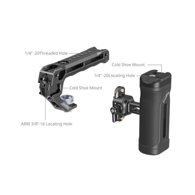 SmallRig mini komplet bočne i gornje ručke 5949 dizajniran je za udobno snimanje u ruci. Komplet uključuje NATO bočnu ručku, ARRI gornju ručku s pozicioniranjem i NATO šinu, osiguravajući besprijekornu kompatibilnost s različitim okvirima za kamere. Ove ručke nude svestrane mogućnosti proširenja putem više sučelja, uključujući rupe za pozicioniranje 1/4"-20 za pričvršćivanje dodataka poput daljinskih upravljača (ID 3902) ili magic armova (ID 3873), kao i nosače hladne cipele za pričvršćivanje nosača monitora (ID 2905B), mikrofona (ID 3487) ili video svjetala (ID 3286B).