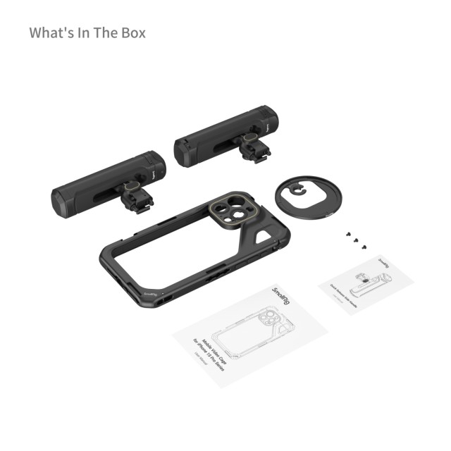 SmallRig Mobile Video Kit (Dual Handheld) za iPhone 15 Pro Max 4392B uključuje dvije ručke koje osiguravaju stabilno snimanje videozapisa i vlogging; bežično upravljanje omogućuje snimanje "jednim klikom". Kavez ima višestruke rupe s navojem od 1/4"-20 i hladne cipele za pričvršćivanje ručke, stativa, mikrofona, LED video svjetla, itd. Svi imaju novi SmallRig Quick Release ekosustav za jednostavno i trenutno prebacivanje između snimanja u vodoravnoj i okomitoj orijentaciji. Također, potpuno metalni kavez podržava takve objektive kao što je M-mount leća ili, zamjenom stražnje ploče, 17 mm / 37 mm leća s navojem, leća serije Moment Suptilno je izdubljena kako bi se omogućio potpuni pristup iPhoneovim gumbima, priključcima, radaru i ultraširokokutnom objektivu te MagSafe bežičnom punjaču, s ugrađenim jastučićima koji sprječavaju moguće udarce i ogrebotine.