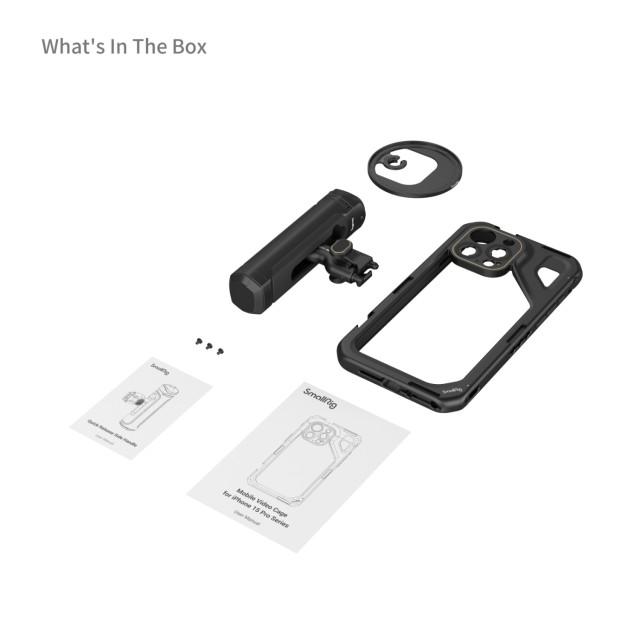 SmallRig Mobile Video Kit (Single Handheld) za iPhone 15 Pro Max 4393B uključuje jednu bežičnu upravljačku ručku, koja omogućuje snimanje "jednim klikom" i osigurava stabilno snimanje videa i vlogging. Kavez ima višestruke rupe s navojem od 1/4"-20 i hladnu papučicu za pričvršćivanje ručke, stativa, mikrofona, LED video svjetla, itd. Svi oni imaju novi SmallRig Quick Release dizajn za jednostavno i trenutno prebacivanje između snimanja u vodoravnoj i okomitoj orijentaciji. Također, potpuno metalni puni kavez podržava takve objektive kao što je M-mount objektiv ili, zamjenom stražnje ploče, 17 mm / 37 mm navojem leće, leće Moment T-serije suptilno su izdubljene kako bi omogućile potpuni pristup iPhoneovim gumbima, priključcima, radaru i ultraširokokutnom objektivu te MagSafe bežičnom punjaču, s ugrađenim jastučićima koji sprječavaju moguće udarce i ogrebotine.
