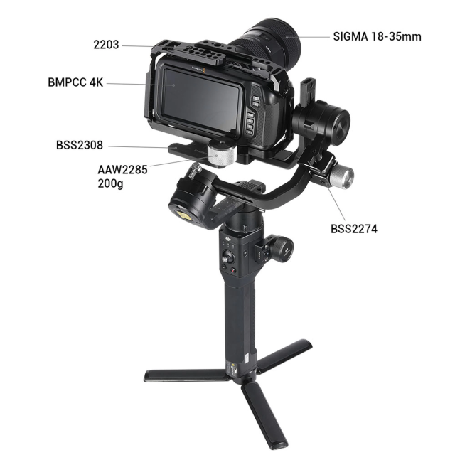 Ova montažna ploča omogućuje pričvršćivanje dužeg objektiva na fotoaparat. Osim toga, ima rupu s navojem od 1/4"-20 na prednjoj strani za smještaj originalnog nastavka za objektiv koji se isporučuje s kamerom Ronin S. Dodatna bočna stezaljka 2274 s protuutegom omogućuje vam balansiranje gimbala kao drugog rješenja, posebno za BMPCC 4K