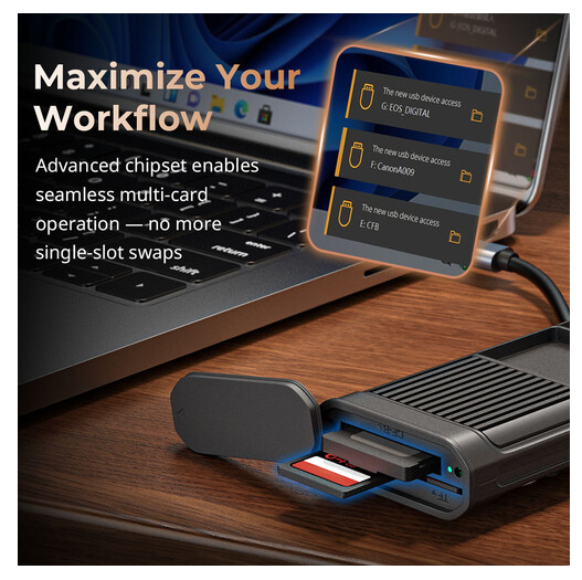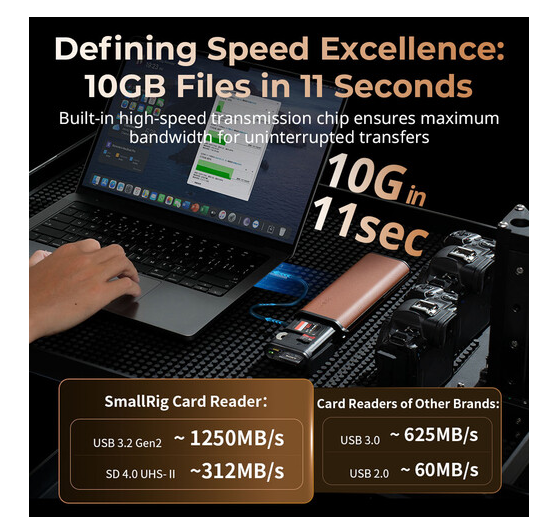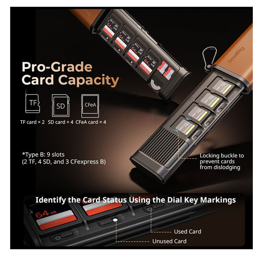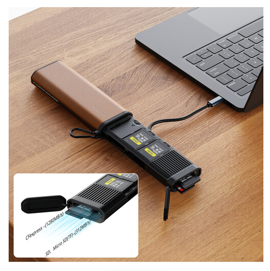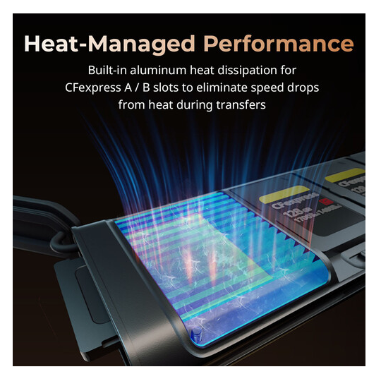 Prenosite podatke nevjerojatnom brzinom do 1250 MB/s i sigurno pohranite do devet memorijskih kartica uz PGYTECH CFexpress Type B višenamjenski čitač kartica i torbicu za pohranu, koji ima istovremeno utore za UHS-II SD/microSD i CFexpress Type B kartice, integrirani USB-C 3.2 Gen 2 kabel s prolaznim punjenjem, aluminijski hladnjak za toplinsku stabilnost, IP54 otpornost na prašinu/prskanje vodom, AirTag utor za praćenje i robusnu ABS/aluminijsku konstrukciju - sve u kompaktnom pakiranju od 240 g.