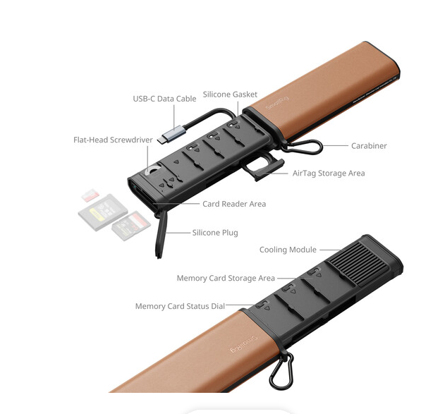 Višenamjenski čitač kartica i torbica za pohranu PGYTECH CFexpress Type B je vrhunsko rješenje "sve u jednom" za profesionalne fotografe i snimatelje, kombinirajući ultrabrzi prijenos podataka, robusnu pohranu kartica i pametan dizajn u jednoj prijenosnoj jedinici. Opremljen jednim utorom za CFexpress Type B (do 1250 MB/s), jednim utorom za UHS-II SDXC i jednim utorom za UHS-II microSDXC, podržava simultane operacije čitanja/pisanja s inteligentnim određivanjem prioriteta propusnosti. Integrirani USB-C 3.2 Gen 2 kabel pruža performanse napajanja preko sabirnice i uključuje prolazni priključak za punjenje kako bi prijenosna računala ili tableti ostali napajani tijekom prijenosa. Ugrađeni aluminijski hladnjak sprječava termičko gušenje, dok kućište od ABS-a i aluminija s IP54 zaštitom od prašine i prskanja vode. Torbica sigurno pohranjuje tri CFexpress Type B, četiri SD i dvije microSD kartice s kopčama protiv ispadanja, a integrirani pretinac za AirTag (AirTag se prodaje zasebno) osigurava jednostavno praćenje putem Appleove Find My mreže. Dodatni alati na setu uključuju ravni ključ i karabiner za sigurnu montažu. Ovaj uređaj dimenzija 6,5 x 2,6 x 1,1" pouzdano radi od -10 do 50 °C i konstruiran je za učinkovitost, izdržljivost i bezbrižnost na terenu.