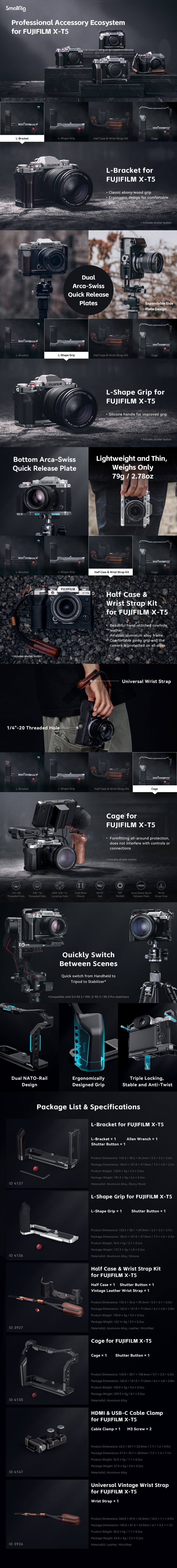 Višenamjenski kavez SmallRig za fotoaparat FUJIFILM X-T5 4135 dizajniran je za zaštitu fotoaparata i pružanje točaka za pričvršćivanje dodataka. Učvršćuje kameru s jednim 1/4"-20 vijkom na dnu i jednim M2 vijkom s obje strane, s gumenim jastučićima protiv ogrebotina i omogućuje potpuni pristup gumbima, utorima za kartice, zaslonu i odjeljku za baterije. Uz ugrađeni -u ruci za bolji doživljaj držanja, kavez ima i razne dodatke za dodatke.