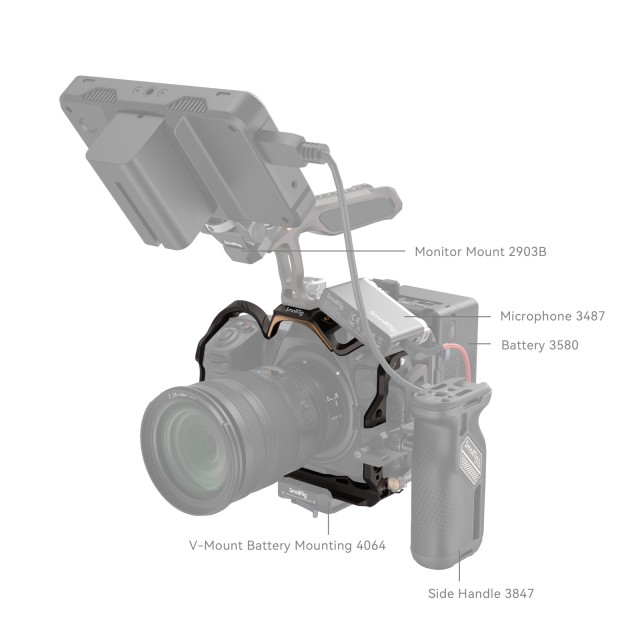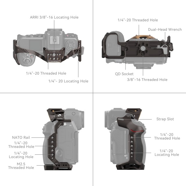 SmallRig “Night Eagle” kavez za Nikon Z 8 4316 dizajniran je za zaštitu fotoaparata i pričvršćivanje dodataka. Odlikuje se potpuno novim dizajnom: tamno smeđe krivulje prošarane zlatom koje nadopunjuju klasični stil Nikon Z 8. Kavez ima sustav zaključavanja u tri točke: osigurajte svoj Nikon Z 8 pomoću donjeg vijka 1/4"-20 i dva M2.5 vijka s obje strane. Ugrađeni jastučići sprječavaju ogrebotine fotoaparata. Nesmetan pristup gumbima, utorima za kartice, preklopnom zaslonu i poklopcu baterije. Odvojivi nosač za hladno svjetlo za LED video svjetlo ili mikrofon opremljen klinom za pozicioniranje kako bi se spriječilo otklon. Među sučeljima za ugradnju dodatne opreme, rupa s navojem 1/4"-20, rupa s navojem 3/8"-16 i ARRI 3/8"-16 rupa za lociranje bočne ručke 2093 , gornja ručka 3765 , nosači monitora 2903 i 2904 , ploče za brzo otpuštanje Manfrotto 1280 i 2458 , montažna stezaljka za prijenosne Power Banke 2336 i ploča za bateriju mini V-Mount 2987 . Bočna rupa za lociranje 1/4"-20 odgovara stezaljci s jednom šipkom 3598 i Magic Arm s dvostrukim kuglastim glavama 3873 , a NATO tračnica s lijeve strane brzo povezuje NATO bočne ručke 3847 i 4017. Osim toga, postoje rupe za remen za ručne trake 3848 i 2456 ; i QD utičnica za QD kopču remena. Arca-Swiss Quick Release ploča na dnu podržava tronožac tipa Arca ili DJI RS 2 / RSC 2 / RS 3 / RS 3 Pro stabilizatore za brzo prebacivanje između stabilizatora, ručni i stativ. Dvostrani ključ također je uključen za jednostavno rastavljanje i sastavljanje.