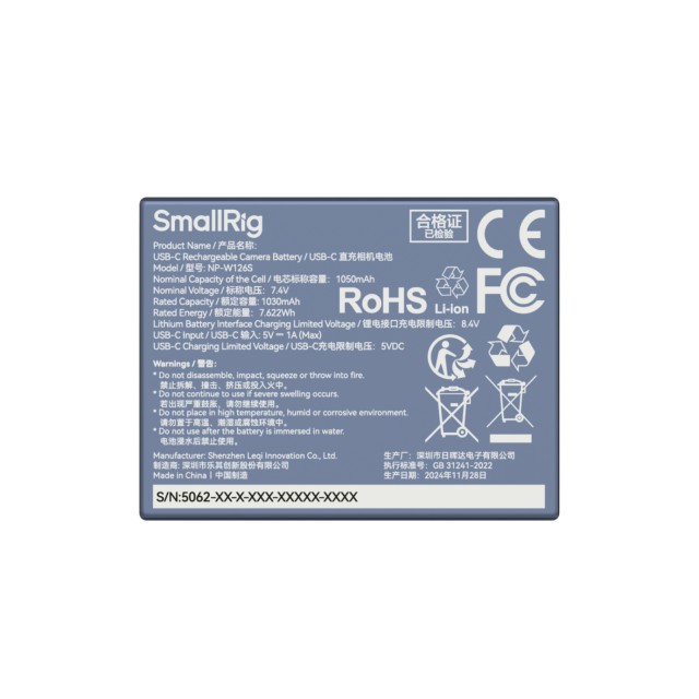 SmallRig NP-W126S USB-C punjiva baterija za kameru 5062 omogućuje punjenje putem power bank-a, razvodnika, auto-punjača ili drugih posebnih punjača. Uz visokostrujno punjenje (5V 1A) i nominalni kapacitet od 1050mAh, bateriju možete napuniti za 2,5 sata i raditi dulje vrijeme. Potpuno dekodirana bez iskačućih prozora, ova vizualno prepoznatljiva baterija ima mat ABS i PC školjke, koje su otporne na vatru i izdržljive. Točno je iste veličine kao originalna baterija fotoaparata, stoga nema brige da će zapeti.