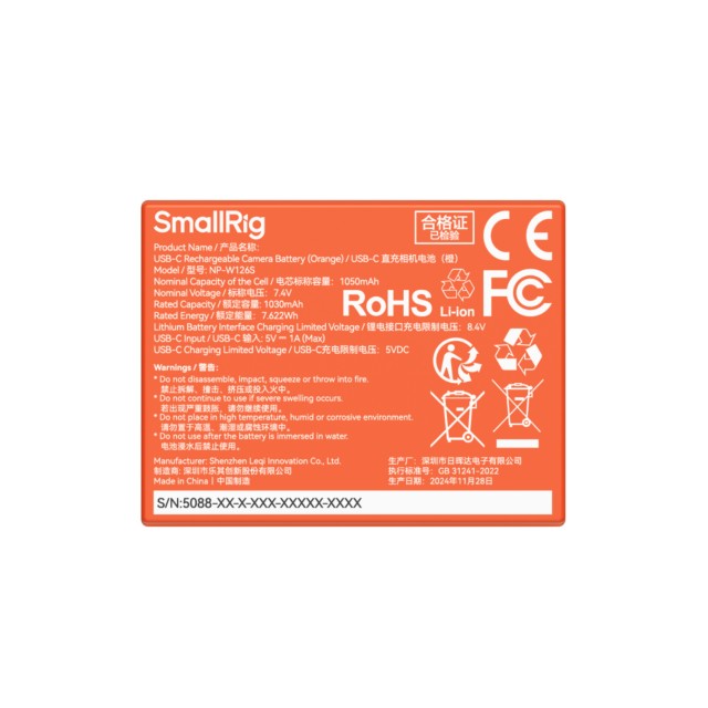 SmallRig NP-W126S USB-C punjiva baterija za kameru (narančasta) 5088 omogućuje punjenje putem power bank-a, razvodnika, auto-punjača ili drugih posebnih punjača. Uz visokostrujno punjenje (5V 1A) i nominalni kapacitet od 1050mAh, bateriju možete napuniti za 2,5 sata i raditi dulje vrijeme. Potpuno dekodirana bez iskačućih prozora, ova vizualno prepoznatljiva baterija ima mat ABS i PC školjke, koje su otporne na vatru i izdržljive. Točno je iste veličine kao originalna baterija fotoaparata, stoga nema brige da će zapeti.