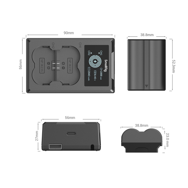 SmallRig Komplet baterije i punjača NP-W235 3822 uključuje dvije baterije i jedan punjač. Baterija je opremljena potpunim čipom za dekodiranje, savršeno podržava različite kamere bez iskakanja i ima visokokvalitetni vatrootporni ABS i mat PC kućište, što osigurava mekoću na dodir i izdržljivost. Iste je veličine kao originalna baterija i stoga lako staje u odjeljak za baterije. Dvostruki punjač može puniti dvije baterije istovremeno, s LCD zaslonom koji prikazuje napon punjenja, struju i napunjeni kapacitet u stvarnom vremenu. Opremljen je ugrađenim USB-A kabelom za punjenje i USB-C ulaznim sučeljem koje omogućuje punjenje putem USB adaptera, auto punjača ili power bank-a.