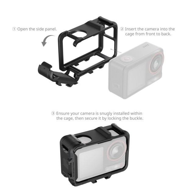 Odjeljku za baterije može se pristupiti izravno sa strane bez uklanjanja kaveza, što omogućuje zamjenu baterije bez napora. Osim toga, rupa za vrpcu s jedne strane omogućuje korisnicima da pričvrste vrpcu po potrebi, pružajući dodatnu sigurnost za kameru u izazovnim okruženjima, dok ugrađeni gumeni jastučići pomažu spriječiti ogrebotine na kameri.