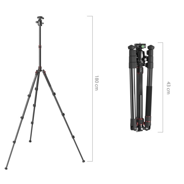 S maksimalnom radnom visinom od 180 cm, ovaj stativ omogućuje raznolike perspektive snimanja, a sklapa se na kompaktnu duljinu od 43 cm. Teži samo 1,56 kg, što ga čini laganim i jednostavnim za transport. Metalna kuglasta glava od 360° pruža robusnu stabilnost, a čvrste noge od aluminijske legure podržavaju nosivost do 15 kg (5 kg za glavu).