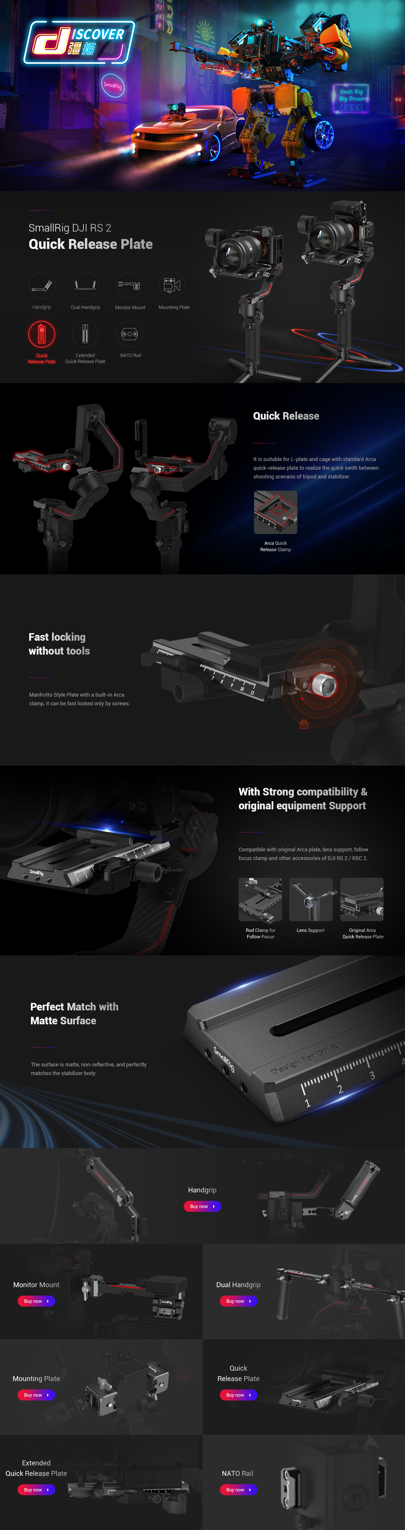 SmallRig Quick Release Plate s Arca-Swiss za DJI RS 2 / RSC 2/Ronin-S / RS 3 / RS 3 Pro 3061 dizajniran je za pomoć korisnicima u izravnoj instalaciji Arca-Swiss standardnog L nosača i kaveza na gimbal, koji se može brzo prebacivati između stativa i gimbala, čime korisniku štedi vrijeme. Ploča za brzo otpuštanje je tipa Manfrotto s ugrađenom Arca-Swiss bazom i može se brzo zaključati vijkom bez alata. Ima podesivi dizajn protiv pada, koji i dalje može postići funkciju protiv pada kada se uskladi s originalnom Arca pločom. Također se može prešati da se prilagodi standardnom Arca-Swiss L nosaču i kavezu na tržištu. Ploča s brzim otpuštanjem preuzima izvorni dizajn ploče za kameru i kompatibilna je s originalnom Arca-Swiss pločom, nosač šipke za fokusiranje opremljen DJI RS 2 / RSC 2 / RS 3 / RS 3 Pro / DJI RS 4 / DJI RS 4 PRO, i ima zupčanik na dnu, što omogućuje lagano podešavanje ploče za brzo otpuštanje.